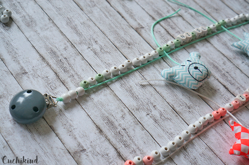 Und fertig ist die personalisierte Kinderwagenkette. Ich habe für jede Kette etwa 2-3 Stunden gebraucht. So genau weiß ich das nie, weil ich immer Fotos dazwischen mache und meist auch nicht alles an einem Tag fertigstelle.