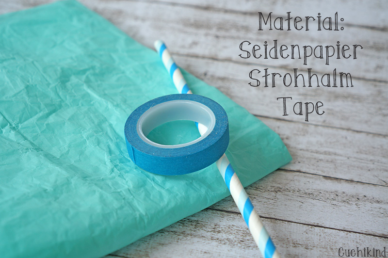 Ich kann euch jetzt gar nicht sagen, wo man Seidenpapier bekommt, ich denke im Bastelladen. Meines habe ich nämlich aus den Paketen meiner Bestellungen von Zara, Lov organic und Co genommen. Die finde ich immer so schön, dass ich sie nie wegschmeiße. Papierstrohhalme bekommt man ja mittlerweile überall und Tape hat sicher jeder von euch zu Hause.