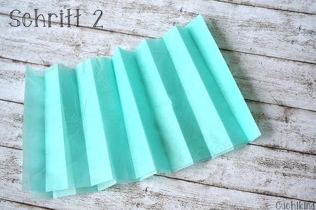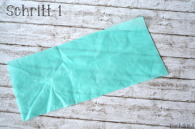 Zuerst schneidet ihr zwei Rechtecke aus dem Seidenpapier aus, die etwa die Maße 10cm x 25cm haben. Diese legt ihr übereinander.