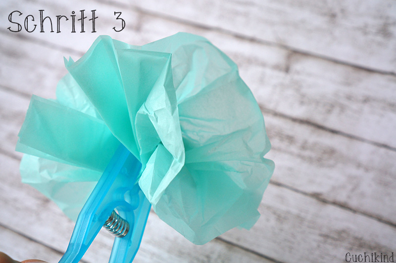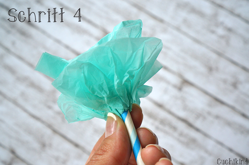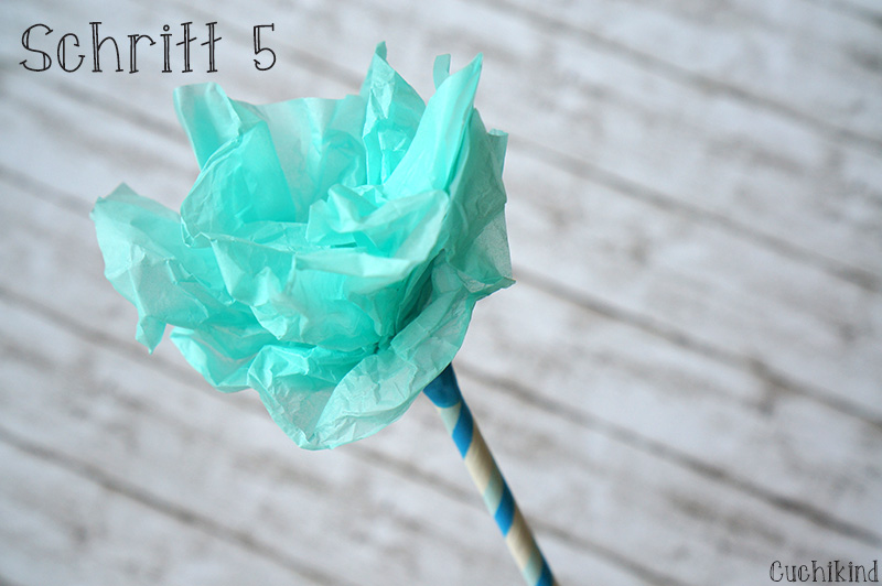 Jetzt fixiert ihr das Seidenpapier mit dem Tape am Strohhalm, so dass das Papier richtig gut hält. Anschließend zieht ihr es noch auseinander und fertig ist die Seidenblume.
