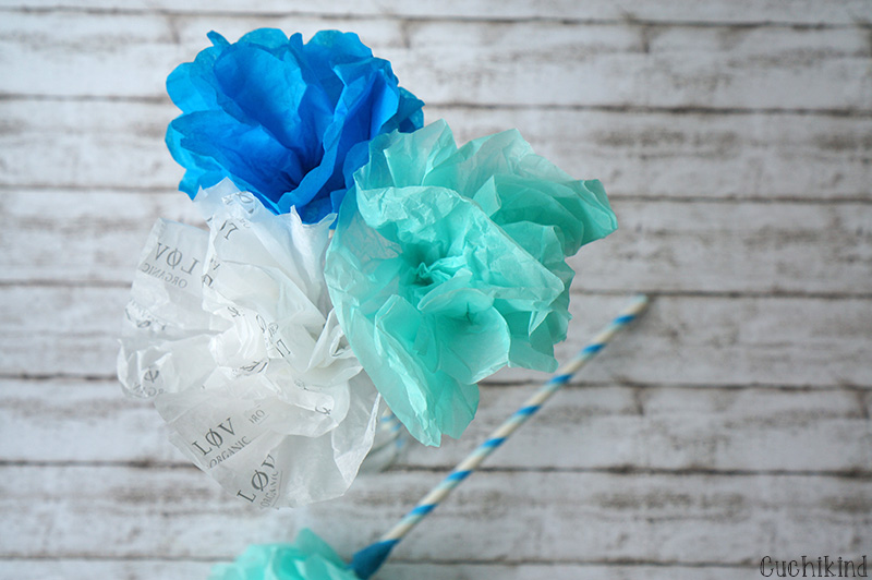 Ich und mein brauner Daumen. Das ist so eine Sache für sich. Ich krieg alles klein, ALLES! Das einzige, was sich seit drei Jahren bei uns hält, sind zwei Buxbäume auf dem Balkon. Und die würde auch keiner mehr kaufen, wenn sie im Baumarkt stehen würden 🙂 Deshalb habe ich schon lange geplant, mir Blumen aus Seidenpapier zu machen, die sehen wenigstens immer schön aus. Ich habe bei Pinterest geforscht, aber irgendwie war das alles nicht das Richtige. Außerdem hatte ich auch keinen Blumendraht oder Ähnliches da. Also habe ich mir meine Blumen eben selbst gemacht. Und hier zeige ich euch, wie es geht: