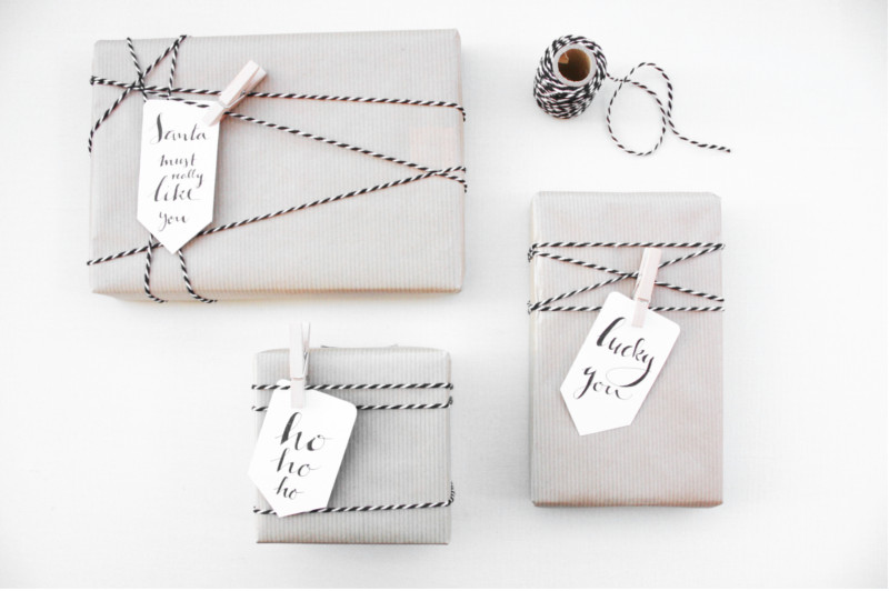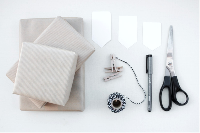 Die Geschenke sorgfältig in Packpapier einwickeln. Bäckergarn ein paar Mal um das Geschenk wickeln, sodass ein hübsches Muster entsteht. Aus der Pappe kleine Schildchen ausschneiden und diese beschriften. Die Schildchen mit den Mini-Wäscheklammern am Bäckergarn befestigen. Fertig!