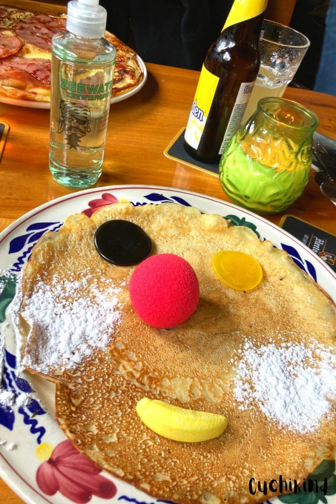 Hier seht ihr den Clown-Pfannkuchen der Kinder. Geparkt haben wir übrigens im Krankenhaus, die Preise dort sind ok und man ist schnell ins Zentrum gelaufen.