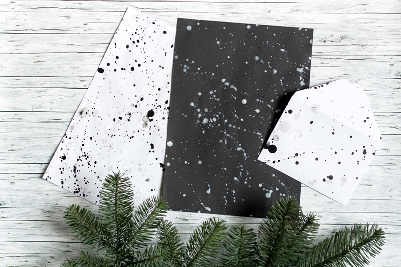 Noch dauert es zwar ein wenig, bis die ersten Geschenke überreicht werden können… aber wenn es euch so geht wie mir und euch das Einpacken mit am meisten Spaß macht, könnte euch meine Idee heute gefallen: Ich zeige euch, wie ich selbst Geschenkpapier und Briefumschläge mit Farbspritzern in schwarz und weiß verziert habe und dazu noch drei Ideen mit dem besprenkelten Papier!