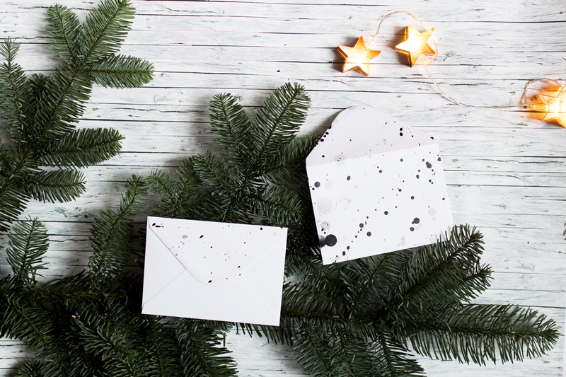 Diese Briefumschläge eignen sich doch super für die Weihnachtspost! Wenn ihr die Lasche nach oben klappt, während ihr die Umschläge mit Farbe bespritzt, dann habt ihr hinterher, wenn der Briefumschlag geschlossen ist, auch eine schöne Rückseite.