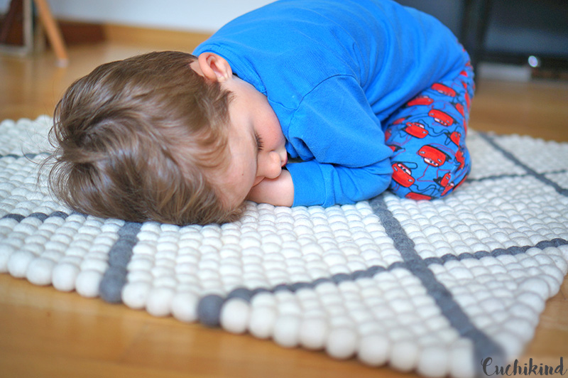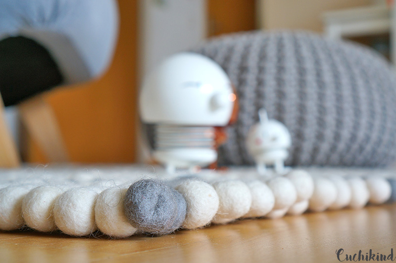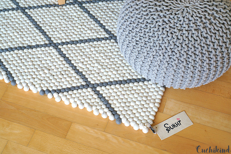 Und ihr kennt das sicher, wenn man umzieht, dann muss auch alles ein bisschen anders werden. Finn bekommt ein komplett neu eingerichtetes Kinderzimmer und auch sonst soll einiges ausgetauscht werden. Und dann haben wir ja endlich ein richtiges Arbeitszimmer mit viel Platz. Erste Ideen zur Gestaltung wurden schon zu Papier gebracht, aber es soll ja auch gemütlich werden. Als dann die Anfrage von Sukhi.de kam, ob ich einen kleinen Filzkugelteppich testen möchte, habe ich mich riesig gefreut. Das ist die Idee. Wir haben ja schon einen ganz bunten, runden Teppich, der in Finns Zimmer liegt und sind super zufrieden damit. Die Qualität ist auch nach 2 Jahren noch einwandfrei, er fusselt so gut wie überhaupt nicht.
