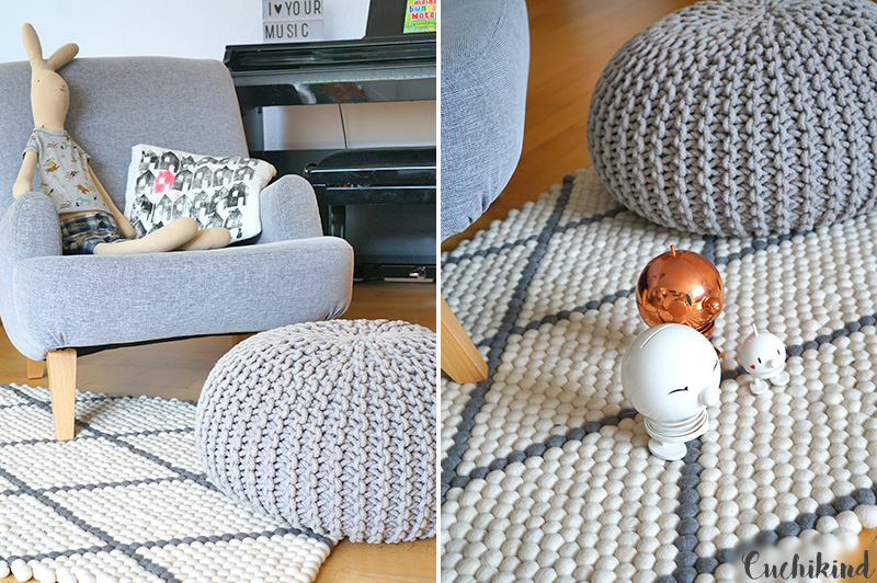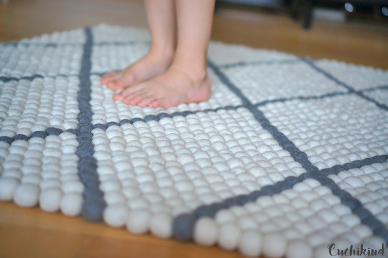 Fürs Arbeitszimmer muss der Teppich natürlich neutraler sein. Ich habe mich also für einen rechteckigen, weißen Filzkugelteppich mit Rautenmuster entschieden. Und ich bin total verliebt. Er ist wunderschön geworden und wartet jetzt nur noch auf den Umzug. Solange wird er hier als Fähre missbraucht. Er ist nämlich ganz kuschelig weich.