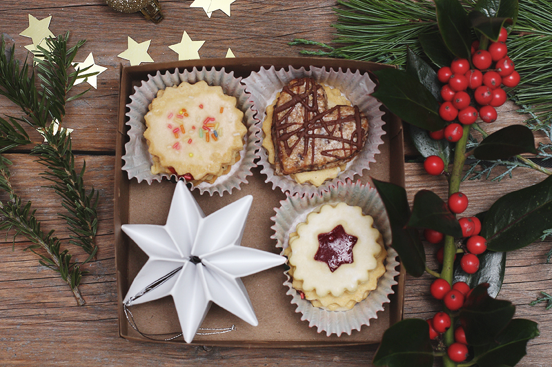 Eine kleine Schachtel mit weihnachtlichen Motivmuffinförmchen bestücken und die Plätzchen einfüllen. Schon fertig 🙂