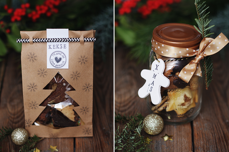 Schraubglas (oder auch Weckglas) mit Plätzchen befüllen und eine hübsche Schleife rumbinden. Einen Tannenzweig dran stecken und/oder einen Anhänger. (Anleitung für die Fimo-Anhänger gibt’s auf meinem Blog).