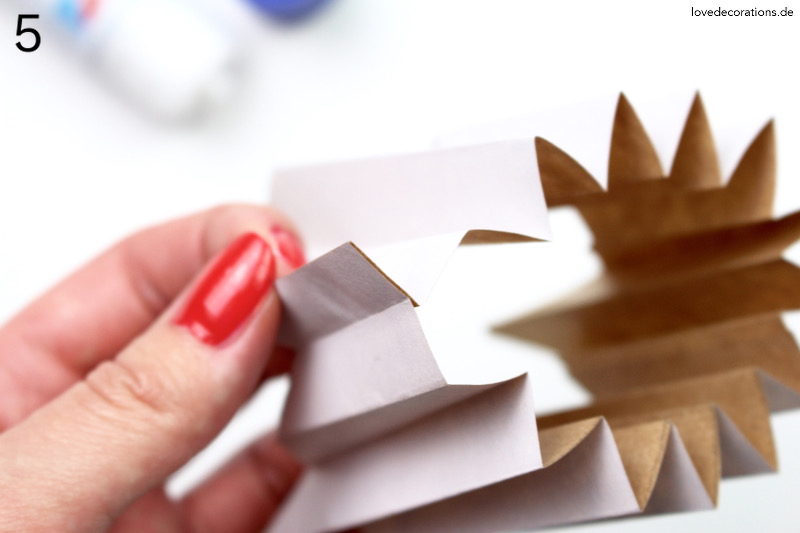 Drehe das Ganze um, so dass die Rückseite oben liegt, mit einem großzügigen Klecks Heißklebepistole Heißkleber in der Mitte fixieren wir den Stern