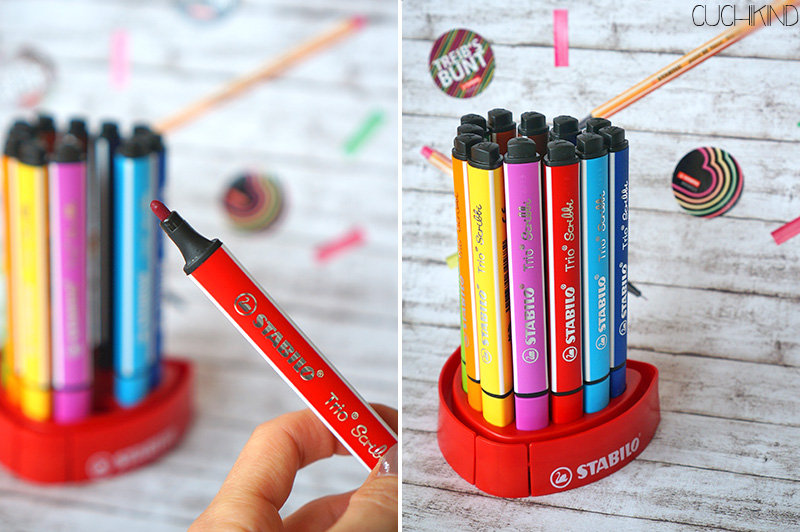 Die Trio Scribbi kannte ich ehrlich gesagt vorher gar nicht. Die sehen ja ganz nett aus, aber sind halt normale Filzstifte dachte ich mir. Aber der Clou an der Sache ist, dass sich die Spitze einfährt, wenn das Kind zu fest aufdrückt. Das war bisher der Grund, warum ich Finn nicht so gerne mit Filzstiften habe malen lassen. Die sind ja nachher alle kaputt, wenn er die Spitzen zerdrückt. Aber jetzt darf er mit seinen eigenen Filzstiften malen und findet das ganz toll. Der Tischständer ist praktisch und Finn bekommt ihn noch nicht alleine auf, so dass er bei uns im Wohnzimmer stehen darf.