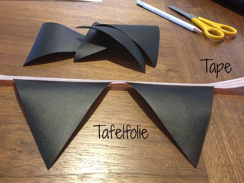 Dieses kleine Mini-DIY habe ich in einer Zeitschrift beim Arzt gesehen 😉 und mir gedacht, prima, das geht schnell und sieht süß aus. Man braucht dazu Tafelfolie und Tape-Band. Und dann kann es los gehen. Einfach kleine Dreiecke in Wunschgröße und Menge ausschneiden und der Reihe nach in ein Tape kleben. Dieses wird dann vorsichtig umgeklappt und fertig. Na, wenn das mal nicht einfach geht. Es wäre besser, man plättet die Dreiecke noch ein wenig, ich fand es aber gerade nett, dass sie nicht so auf der Wand aufliegen. Geschmackssache.