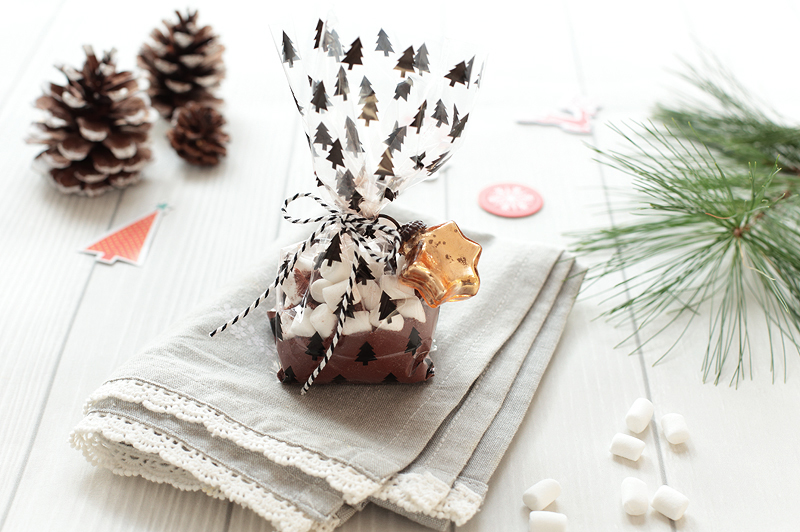- Für den heißen Schokoladenmix habe ich 10 TL Kakao und 18 TL Zucker und 1/2 TL Zimt in ein Tütchen gefüllt. Wenn ihr Kaba hernehmt, müsst ihr diesen nicht mit Zucker mischen. Bei echten Kakao aber bitte Zucker dazu, sonst wird der Kakao dann zu bitter. Diese Mischung reicht dann für 10 Tassen-Portionen. Ganz am Schluss werden noch die Mini-Marshmallows eingefüllt und die Tüte mit einer Schnur verschlossen. Schon ist euer kleines selbstgemachtes Geschenk fertig.