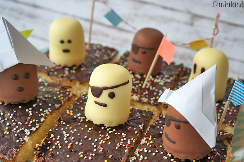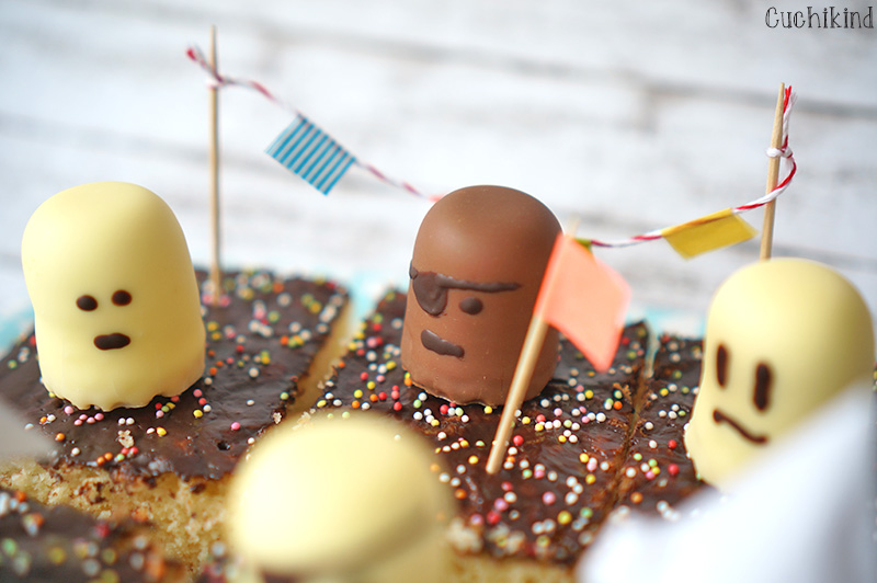 Ich habe für den letzten Tag einen Piratenkuchen gebacken, der aus einem Fantakuchen und kleinen Schokoküssen besteht (hier hatte ich etwas Ähnliches gemacht).